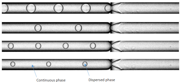 Below you see one droplet generator, during one run, creating different droplet sizes. Here the ratio